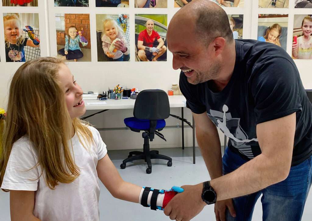 Around that same time, desktop 3D printers were emerging in their infancy. Mat saw an opportunity to apply his engineering skills in a new way – making an existing open-source 3D-printed hand for a young boy named Eli. Helping to pick out the colours, Eli helped Mat to design an “Iron Man” themed hand to make him feel like a super-hero.
